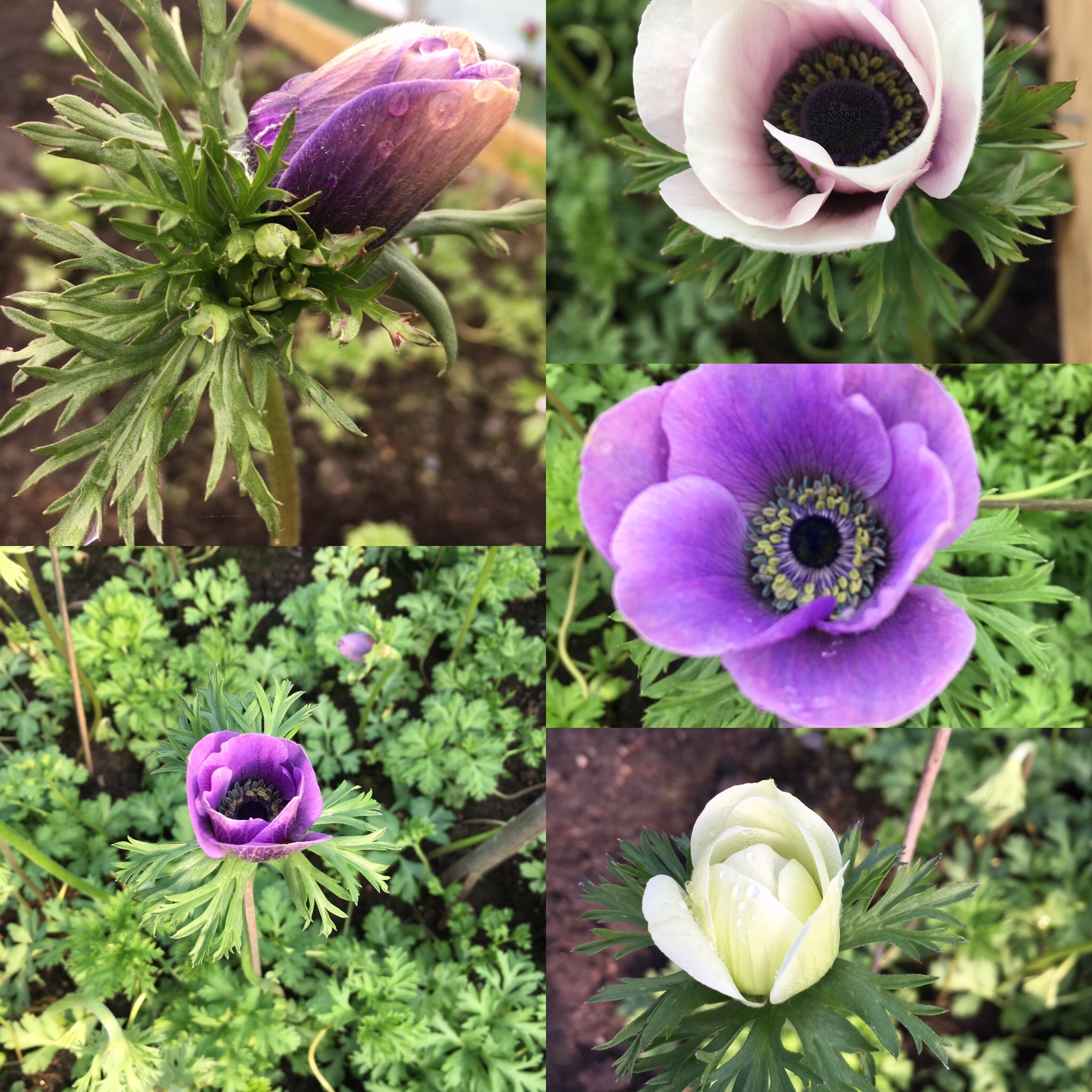 Galilee Anemones were planted three months ago and now they are starting to flower in the polytunnel. They are coming up very tall, and at the moment are in purple, pink and white with lovely fresh foliage.