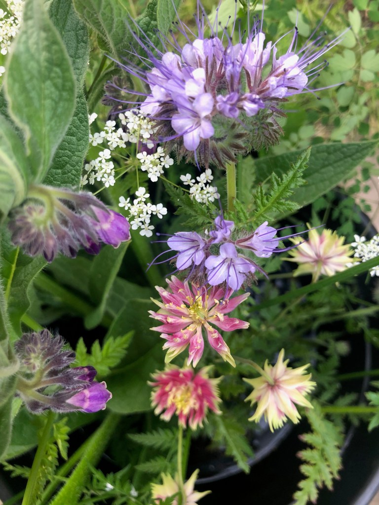 Flowers and foliage are bursting open, the sun is hot and the soil is starting to dry out. Biennials such as foxgloves and sweet william are being sown for next year. Perennials planted as seeds are thriving and annuals are budding too. Such a wonderful time, the nettle tea and comfrey tea are being made to feed the plants. The sweet peas are climbing high, all side shoots and tendrils removed ready to be laid down to get those longer stems. Ornamental grasses and dahlias are shooting up in the polytunnel and for the first time I am growing stocks, the smell is heavenly, but they are a little small at the moment!